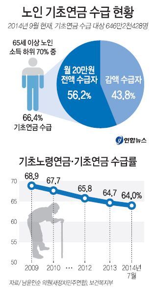 남윤인순 의원에 따르면 지난 7월 기초노령연금을 확대한 기초연금 제도가 시행된 이후 9월 현재 수급대상인 전체 65세 이상 소득 하위 70% 노인(646만2428명)중에서 실제로 기초연금을 받는 노인은 66.4%(429만2562명)에 불과했다. 연합뉴스