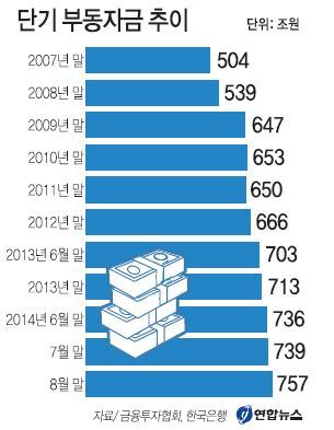 28일 금융투자협회와 한국은행에 따르면 지난 8월 말 현재 단기 부동자금은 757조4383억원으로 사상 최대를 기록했다.