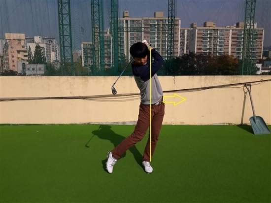 바른 피니쉬 동작을 만드는 연습방법으로 사진3과 같이 왼발을 30cm 정도 아래로 내리고 스윙을 하면 힙회전이 좋아져 슬라이딩 되지 않고, 체중이 오른발에 남는 동작도 같이 고쳐질 수 있다.