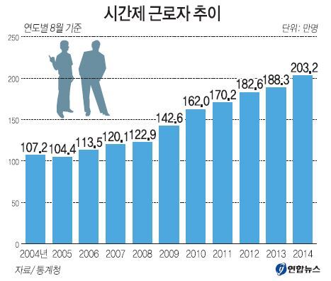 국내 취업자의 100명 중 8명가량이 시간제 근로자인 것으로 나타났다. 여성 취업자는 100명 중 13명꼴이나 됐다. 시간제 근로자는 꾸준히 늘어왔지만 세계 금융위기 이후 급증했다. 정부가 시간제 근로를 장려한 영향도 컸던 것으로 풀이된다. 경력단절 여성에겐 가사와 함께 바깥일도 할 수 있는 기회가 되지만, 실상은 60세 이상에서 주로 늘고 있다.