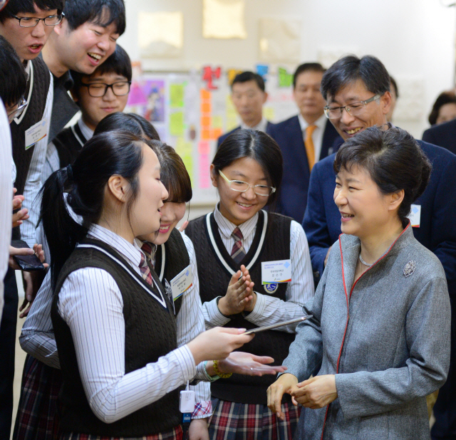 ▲ 박근혜 대통령이 24일 오전 전주 전북창조경제혁신센터 출범식을 마친 후 센터를 시찰하던 중 한국게임과학고 학생들과 게임을 시연해보고 이야기를 나누고 있다. 안봉주기자 bjahn@
