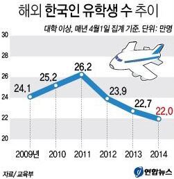 7일 교육부에 따르면 2014년도(이하 매년 4월1일 기준) 국외 한국인 유학생(대학·대학원 등 고등교육)은 모두 21만9543명으로 지난해 22만7126명보다 3.3%(7583명) 줄었다.