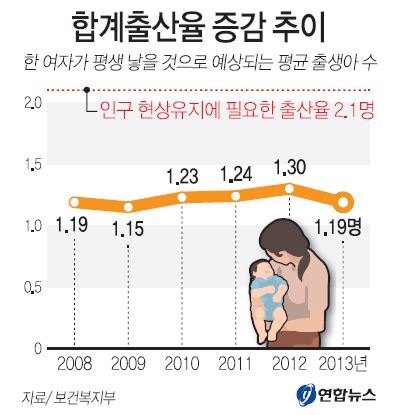 합계출산율은 2008년 1.19명에서 2009년 1.15명으로 떨어진 뒤에는 2010년 1.23명, 2011년 1.24명, 2012년 1.30명으로 증가 추세를 이어갔으나 작년에는 5년 전인 2008년 수준으로 다시 하락했다.