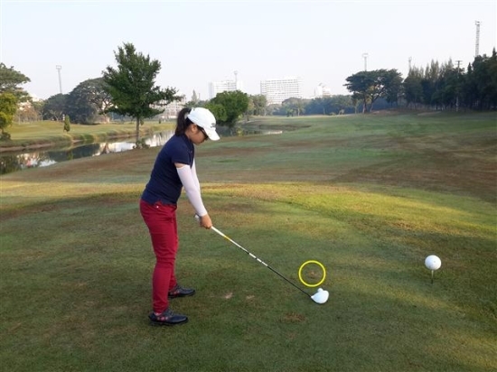 사진1과 같이 셋업 했을 때 볼 앞에 보이는 지점을 임의로 정하는 것이 필요하다. 이 중간 목표는 멀리에 만들 필요가 없다. 사진에서 보듯이 1~3m 앞에 목표를 잡아주는 것이 포인트이다.