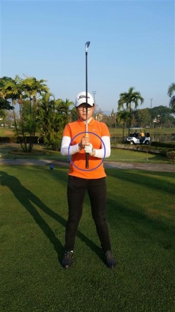 가장 먼저 타석에 서서 사진1과 같이 클럽을 짧게 쥐고 어드레스를 취한다. 클럽을 바닥에 닿지 않게 어드레스를 취한 후 멈추지 않는 연속동작을 하도록 긴장을 풀어 줘야 한다.