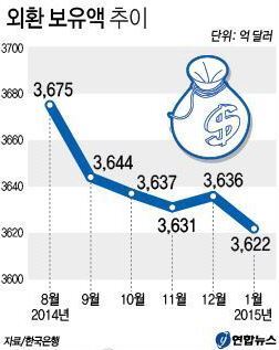 박병걸 국제총괄팀 차장은 “ECB의 양적완화로 미국 달러화가 강세를 보이면서 유로화나 파운드화 등 다른 통화 표시 보유자산이 달러화 환산액으로는 감소한 데 따른 것”이라고 설명했다.