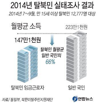 이번 조사 결과 탈북민 임금근로자의 월평균 소득은 147만1000원으로 집계됐다. 이는 2013년 조사 때보다는 5만7000원 증가한 것이지만, 일반 국민(223만1000원)의 66%에 불과했다.