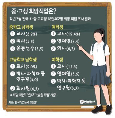 한국직업능력개발원은 22일 ‘2014년 학교진로교육 실태조사’ 자료에서 작년 7월설문에 응한 전국 초·중·고교생 18만402명의 희망 직업을 조사한 결과, 남녀 중·고등학생과 여자 초등학생들이 교사를 가장 희망하는 직업으로 꼽았다고 밝혔다.