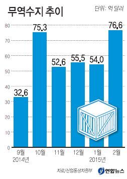 산업통상자원부는 지난달 수출액이 414억5600만달러로 작년 같은 달보다 3.4%줄었고 수입은 337억9900만달러로 19.6% 감소한 것으로 잠정 집계됐다고 1일 발표했다. 이에 따라 2월 무역수지는 76억5800만달러의 흑자를 내 월간 기준으로는 사상최대 규모를 기록하면서 2012년 2월 이후 37개월 연속 흑자 행진을 이어갔다. 뉴스