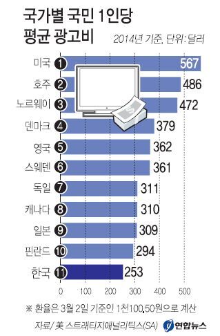 미국에 이어 국민 1인당 평균 광고비가 많이 든 국가는 호주(53만원), 노르웨이(52만원), 덴마크(42만원), 영국(40만원) 순이었다.