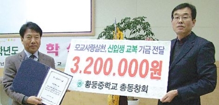 총동창회가 후배사랑의 뜻을 모아 이날 학교측에 전달한 교복기금은 신입생 20명 전원을 대상으로 1인당 16만원씩 모두 320만원을 기탁했다.