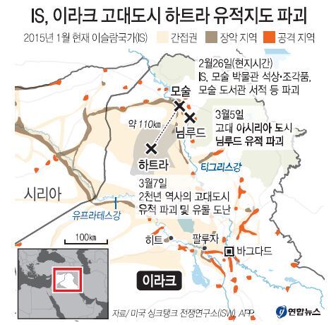 지난 5일 이라크 북부의 고대도시 님루드의 유적을 무너뜨린 ‘이슬람국가’(IS)가 이번에는 2000년 역사의 고대도시 하트라까지 파괴하기 시작했다고 이라크 관리들이 7일(현지시간) 밝혔다.