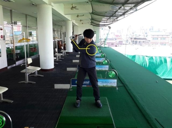 스윙 아카의 크기는 어깨회전이 결정한다. 클럽이 뒤로 많이 넘어간다고 해서 아크가 크다고 볼 수 없다. 사진1에서는 일반 골퍼들이 만들어내는 아크가 작은 스윙이다. 어깨의 회전은 전혀 이루어지지 않은 상태에서 팔만 들어 올린 것으로, 클럽헤드가 많이 넘어가지만 어깨의 위치가 턱까지 돌아가지 않은 것이다. 이는 상체의 꼬임을 하지 않고 팔로만 스윙한 것으로 비거리의 손해를 많이 볼 수밖에 없다.