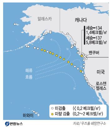 우즈홀 해양연구소에 따르면 지난 2월 19일 캐나다 서부 밴쿠버섬 유클루릿 앞바다에서 수거한 샘플에서 후쿠시마 원전사고로 인한 방사성 물질이 검출됐다. 후쿠시마에서 유클루릿까지의 거리는 약 7천350㎞다. 원전사고로 태평양에 유출된 방사능 오염수가 약 4년 만에 태평양을 횡단해 북미 연안에 닿은 것이다.
