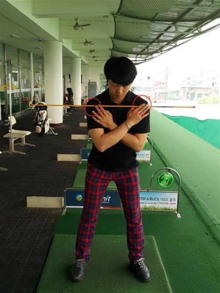 어깨회전은 기다란 막대를 이용해 연습하면 도움이 많이 된다. 긴 막대가 없다면 아이언이나 드라이버를 이용해도 무방하다.