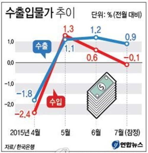 앞서 수출 물가는 5월에 전달대비 1.1%, 6월에 1.2% 상승했다. 환율효과를 뺀 계약통화 기준 수출 물가는 전월보다 1.7% 떨어졌다.