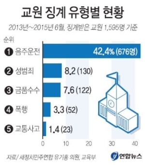 국회 교육문화체육관광위원회 소속 새정치민주연합 유기홍 의원이 2일 교육부에서 ‘교원 징계 유형별 현황’ 자료를 제출받아 분석한 결과, 2013년부터 올해 6월까지 징계받은 초·중·고등학교 교원 1595명 중 음주운전이 676명(42.4%)으로 가장많다.