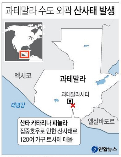 과테말라 수도 과테말라시티에서 15㎞ 떨어진 산타 카타리나 피눌라 시의 한 마을에서 지난 1일 밤 발생한 산사태로 3일까지 70여명이 사망하고 300여명이 실종된 상태다.