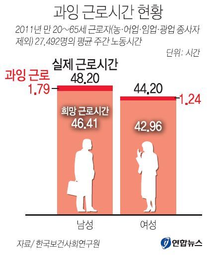 25일 한국보건사회연구원의 학술지 보건사회연구 최근호(9월호)에 실린 ‘노동시간 불일치와 근로자의 건강과의 관계 분석’(한국문화관광연구원 부연구위원)에 따르면 2011년 ‘한국근로환경조사’(산업안전보건공단) 결과를 분석한 결과, 조사 대상인만 20~65세 근로자(농·어업·임업·광업 종사자 제외) 2만7492명의 평균 노동시간은 46.54시간이었다.