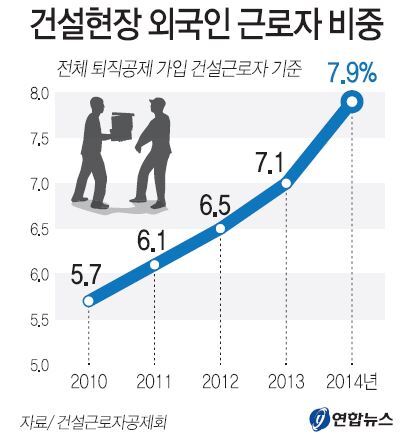 국내 건설 근로자 중에서는 20대 근로자가 매년 늘고 있다. 연령별 분포를 보면50대가 가장 많았다.