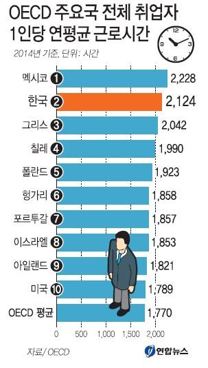 2일 OECD의 ‘1인당 평균 실제 연간 근로시간’ 통계에 따르면 2014년 국내 임금 근로자와 자영업자 등 전체 취업자의 1인 평균 근로시간은 2124시간으로 OECD 회원국 34개국 가운데 멕시코(2228시간) 다음으로 길었다. 이는 시간제 근로자까지 포함한 수치다.