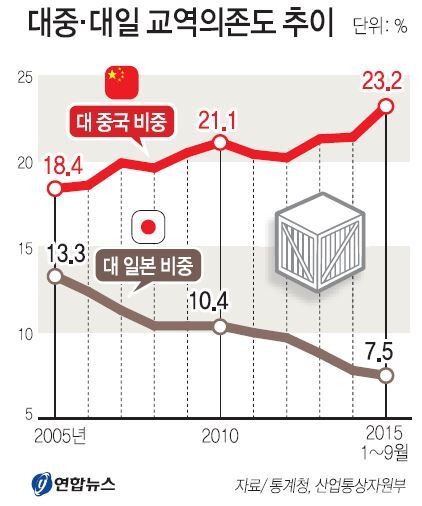 엔저(円低) 여파 등으로 일본과의 교역 비중은 반세기 만에 가장 낮은 수준으로떨어졌다.