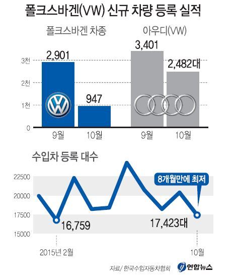 5일 한국수입자동차협회에 따르면 폴크스바겐 차종의 10월 등록 실적은 9월 2901대에 비해 무려 2000대 가까이 줄어든 947대로 집계됐다.