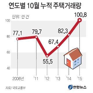 작년 주택거래량은 관련 통계를 작성하기 시작한 2006년(108만2000건)을 빼고 최대치였다. 그러나 올해 주택거래량이 두 달을 남기고도 작년 전체 거래량을 넘어섬에 따라 올해 사상 최대 주택매매가 기록될 것으로 보인다. 10월 주택거래량은 10만6274건으로 작년 동기보다 2.8% 감소했고 전월(9월)과 비교해서는 23.4% 늘었다.