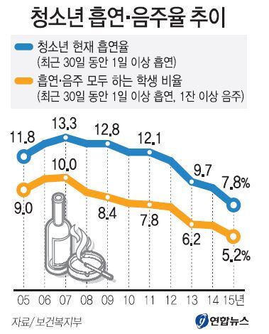 보건복지부 질병관리본부는 이 같은 내용이 담긴 ‘2015년 청소년 건강행태 온라인조사’ 결과를 16일 발표했다. 6~7월 실시된 이번 조사에는 전국 17개 시·도 800개 중·고등학교 학생 6만8043명이 참여했다. 조사 결과 ‘최근 30일 동안 1일 이상 흡연한 사람의 비율’을 뜻하는 현재 흡연율은 7.8%를 기록해 조사가 시작된 2005년 이후 가장 낮았다.