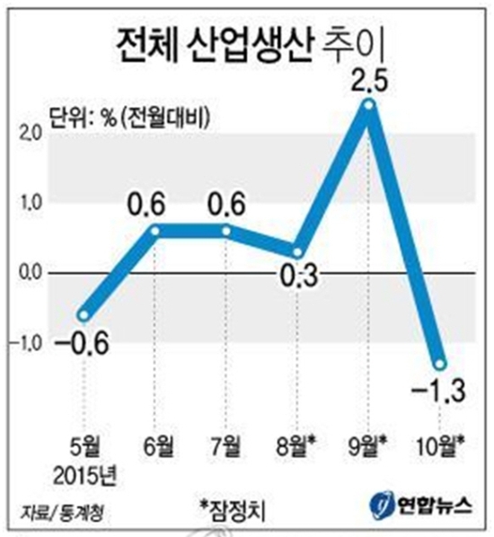 통계청이 30일 발표한 ‘산업활동동향’을 보면 10월의 전체 산업생산은 전월보다 1.3% 감소했다.