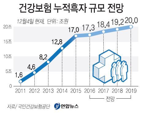 건강보험 누적적립금은 2011년 1조6000억원을 나타내며 재정 흑자로 돌아서고 해마다 큰 폭으로 늘고 있다. 누적흑자 규모는 2012년 4조6000억원, 2013년 8조2000억원, 2014년 12조8000억원 등으로 눈덩이처럼 불어나고 있다.