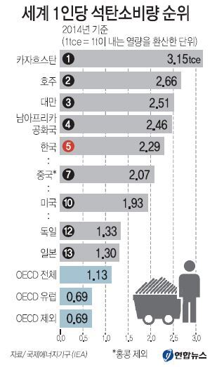 우리나라 국민 1인당 소비하는 석탄량이 세계에서 5번째로 많은 것으로 나타났다.