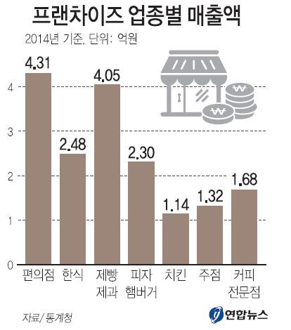 주요 프랜차이즈 가맹점당 매출액을 보면 편의점이 4억3090만원으로 가장 높았고 제빵·제과가 4억450만원으로 그 뒤를 따랐다.