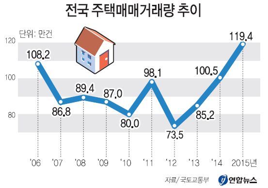 11일 국토교통부에 따르면 2015년 주택거래량은 2014년보다 18.8% 증가한 119만3691건으로 종전 최대치인 108만2453건(2006년)을 11만여건 웃돌았다.