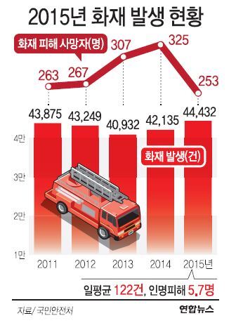2014년과 비교하면 화재가 5.5% 늘었지만 사망자는 22.2% 줄었다.
