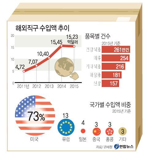 13일 관세청의 ‘전자상거래물품 통관현황’ 자료를 보면 작년 해외직구물품 수입액은 총 15억2342만8000달러로 1년 전보다 약 1.4%(2148만7000달러) 줄었다. 연합뉴스