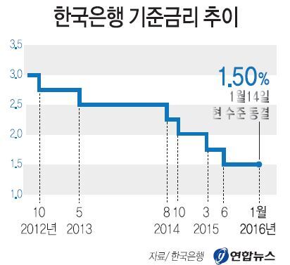 이로써 기준금리는 2014년 8월과 10월, 작년 3월과 6월에 각 0.25%포인트씩 총 1%포인트가 내린 뒤 7개월째 연 1.5% 수준에 머물게 됐다.