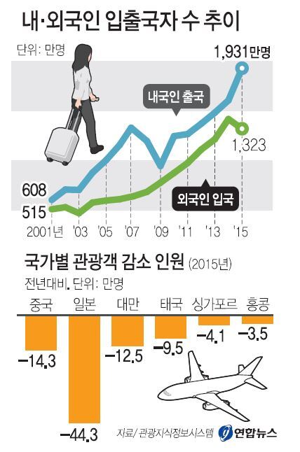 외국인 관광객이 줄어든 것은 2003년(-11.1%) 이후 12년 만에 처음이다.