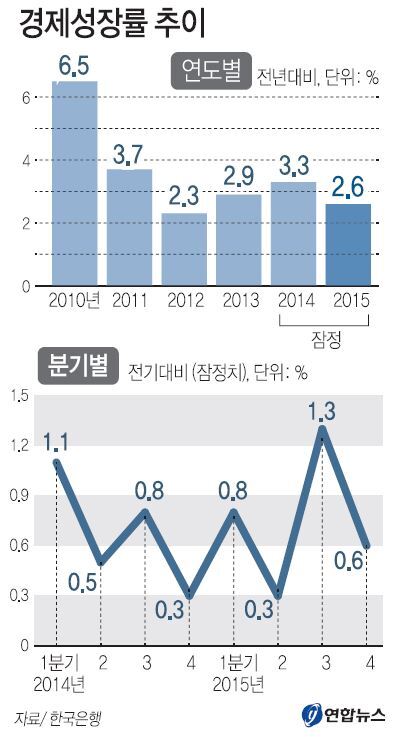 작년 메르스(중동호흡기증후군) 사태에 따른 내수 부진과 수출 감소 등의 여파로 우리나라의 경제 성장률이 3년 만에 가장 낮은 2.6%에 그쳤다.