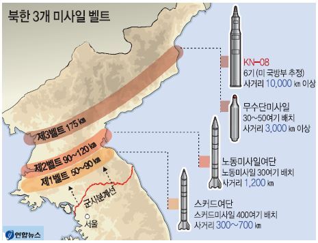 특히 후방에 사거리 3000㎞의 무수단(BM-25) 중거리미사일에 이어 사거리 1만㎞ 이상의 KN-08까지 추가되면 북한 전역이 ‘전략·전술미사일 기지’로 변해 위협은 더욱 가중될 것이란 전망이 나온다. 연합뉴스