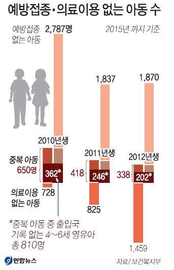 출생 이후 시기별로 받아야 할 예방접종과 건강검진, 진료기록이 없으면서 국내에 거주하는 4~6세 영유아가 810명인 것으로 집계됐다. 보건복지부는 이들에 대한 부모의 의료 방임 등 학대가 의심되는 만큼 다음 달부터 가정 방문조사를 벌여 양육환경을 점검할 계획이라고 25일 밝혔다. 점검 대상은 2010~2012년 출생한 아동 중 건강검진을 포함한 의료이용 정보가 없는 3012명과 국가예방접종 기록이 전혀 없는 6494명의 정보를 연계·분석해 선별했다. 이 중 출입국 기록이 없어 국내에 거주하는 것으로 추정되는 810명이 우선 조사대상이다. 연합뉴스