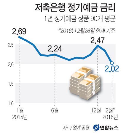 29일 업계에 따르면 현재 저축은행중앙회에 등록된 1년 정기예금 상품 90개의 평균 금리는 2.02%로 집계됐다.