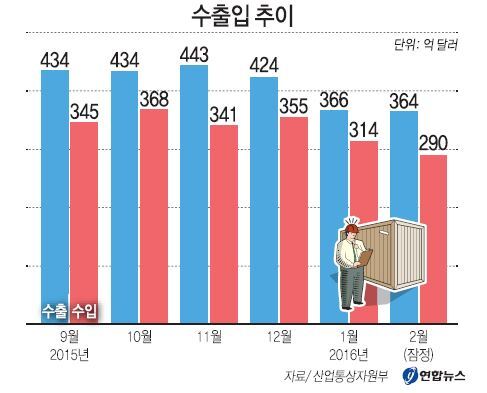 올해 2월 수출액은 364억달러로 작년 같은 달보다 12.2% 줄어든 것으로 잠정 집계됐다고 산업통상자원부가 1일 밝혔다.