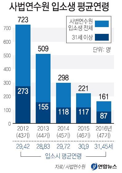 사법연수원은 2일 입소하는 47기 사법연수생 161명의 평균 연령이 31.45세로 나타났다고 밝혔다. 이는 전년도 입소생의 30.9세보다 0.55세 올라간 것이다. 자료가 남아 있는 1984년 이후 최고령이다.