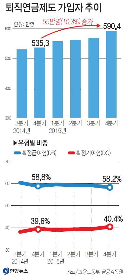 6일 고용노동부와 금융감독원이 공개한 2015년 말 기준 퇴직연금 현황 자료를 보면 퇴직연금 가입자는 총 590만4000명으로 1년 전보다 55만명(10.3%) 늘었다. 이는 전체 상용근로자 수(1100만명)의 절반을 웃도는 53.6%에 해당한다. 유형별 가입자 수를 보면 퇴직급여 수준이 사전에 결정돼 있는 확정급여형(DB)이 343만6000명으로 1년 전보다 9.1% 늘었고, 적립금 운용 실적에 따라 퇴직급여가 변동되는 확정기여형(DC)이 238만5000명으로 12.6% 증가했다. 연합뉴스