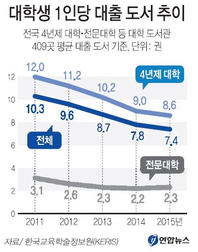 7일 한국교육학술정보원(KERIS)이 펴낸 ‘2015년 대학도서관 통계분석 자료집’을보면 지난해 전국 4년제 대학과 전문대 391곳의 대학 도서관 409곳에서 재학생 1명당 평균 7.4권의 책을 빌린 것으로 나타났다.