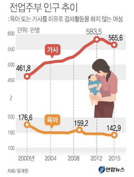 21일 통계청의 경제활동인구조사 결과를 보면 지난해 ‘가사’와 ‘육아’를 이유로경제활동을 하지 않은 여성(전업주부)은 708만5000만명으로 1년 새 5만8000명(0.8%) 줄었다.