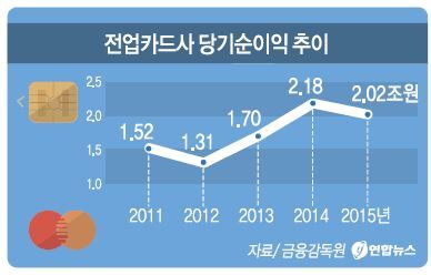 29일 금융감독원이 공개한 신용카드사 2015년 영업실적 자료를 보면 지난해 전업카드사의 당기순이익은 2조158억원으로 2014년(2조1786억원) 대비 7.5%(1628억원) 줄었다.