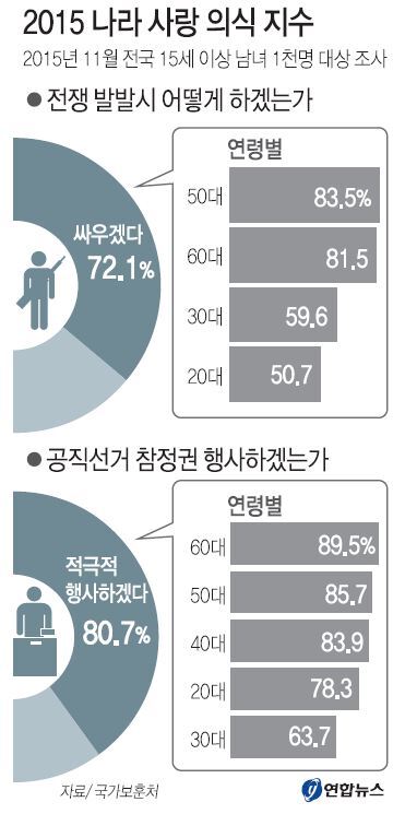 국가보훈처는 지난해 11월 전국의 15세 이상 남녀 1000명을 대상으로 ‘2015 나라사랑 의식 지수’ 설문조사 결과, 참여자 72.1%가 전쟁이 발발하면 우리나라를 위해 싸우겠다고 응답했다고 30일 밝혔다.