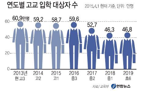 교육부 관계자는 “저출산 여파로 2008년과 2009년 초등학교 취학 아동이 급감한 ‘인구 절벽’ 현상이 중학교를 거쳐 이제 고교 단계에 이르게 된 것”이라며 “내년에 고교 ‘인구 절벽’이 개시되는 셈”이라고 설명했다. 연합뉴스